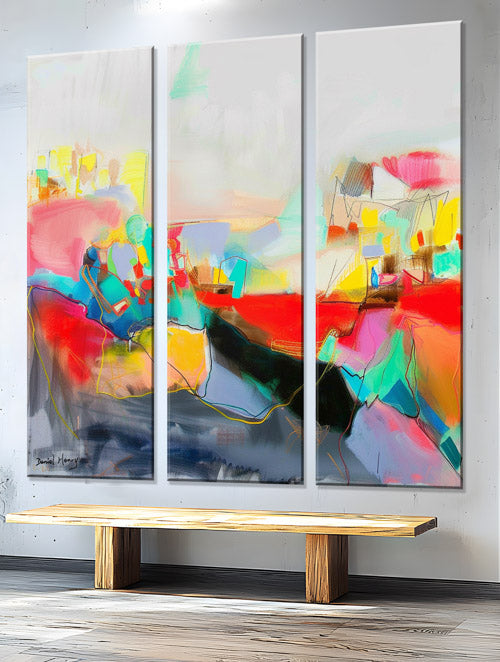 Deniel Henry's "Kaleidoscope Dreams" is a mesmerizing 5-panel abstract masterpiece that captivates the eye and stirs the soul. This vibrant composition is a symphony of color and form, where geometric shapes dance across the canvas in a jubilant celebration of life's vivacity.